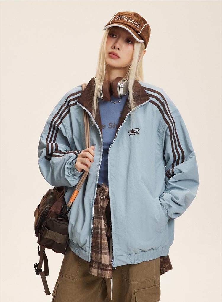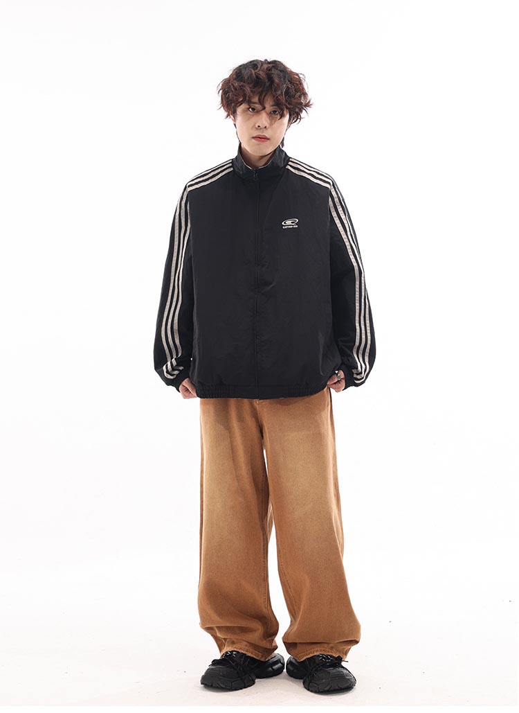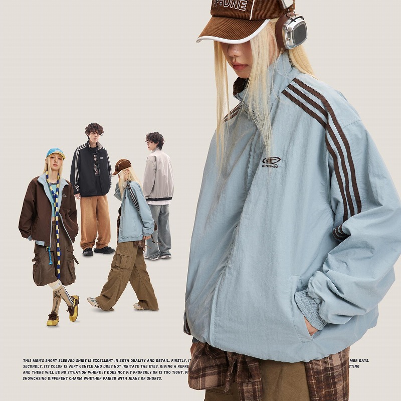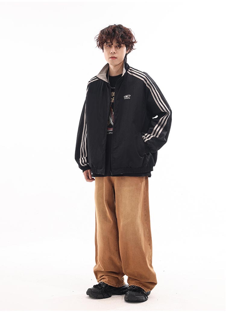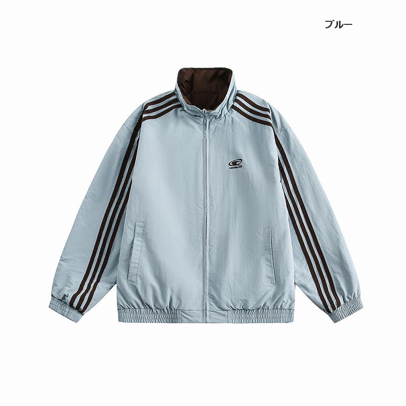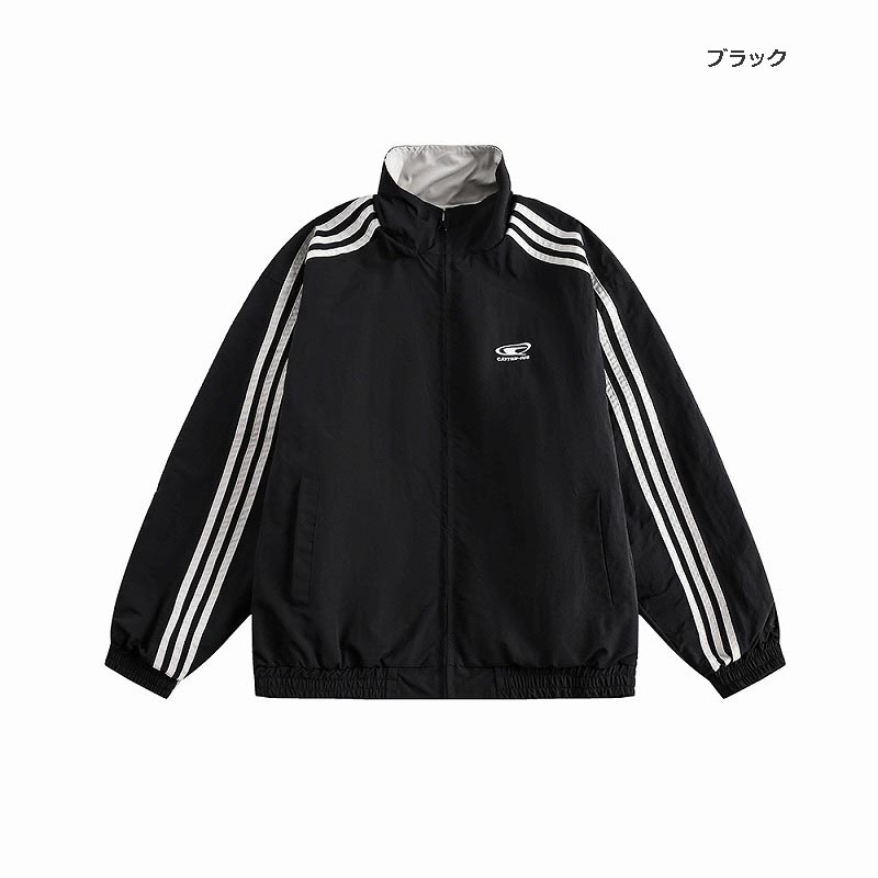 スポーティーな三本線デザインが印象的なリバーシブル仕様のトラックジャケット。