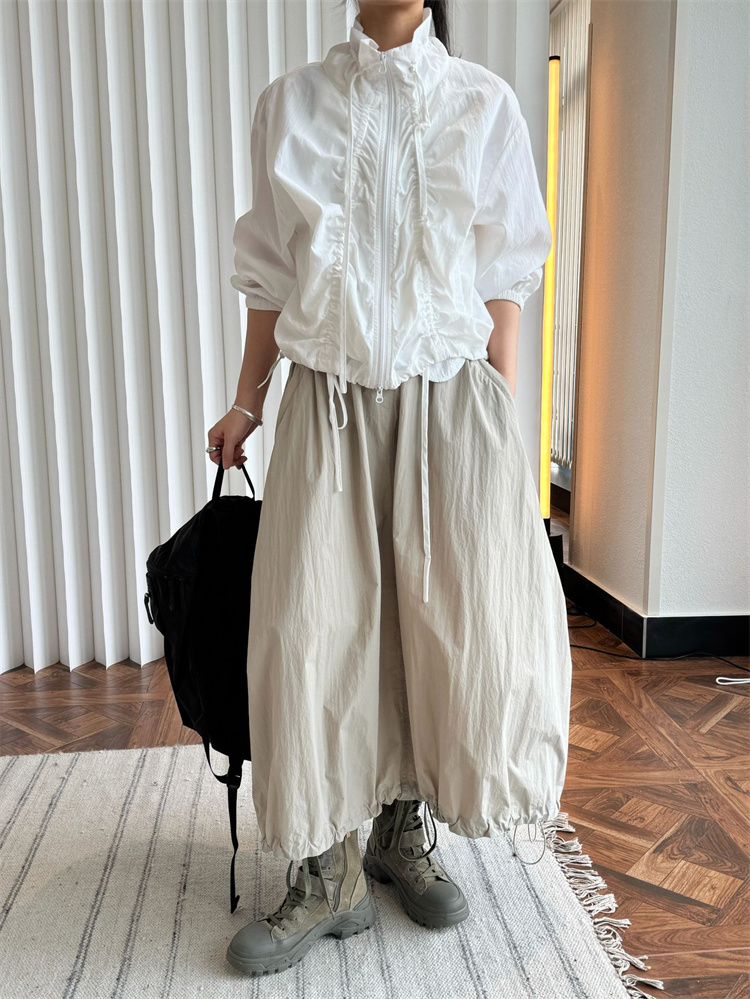 サイドのプリーツデザインとドローコードでスタイリッシュな印象に。